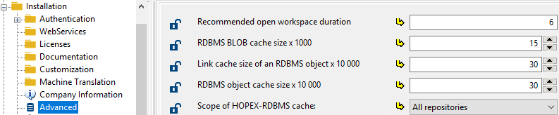In RDBMS storage case, with repositories including a large amount of objects, we advise you to increase the size of RDBMS caches. The larger your cache space, the fewer the network exchanges and the better your HOPEX performance.