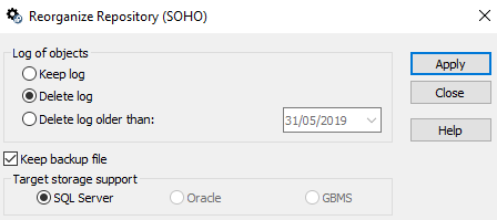 4. (Optional) If you do not want to keep the repository log, clear Keep backup file.