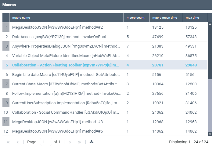 Example: in the above example click the fifth row to get detailed information regarding the macro "Collaboration - Action Floating toolbar".