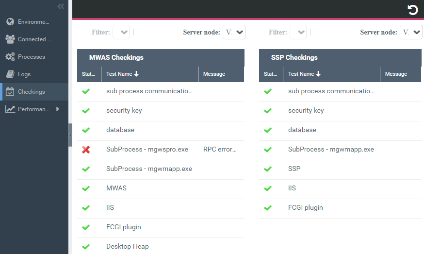 You can check, for each Server node, whether the MWAS and SSP are fully operational or not.