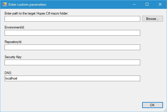 8) Enter all the fields: Path to the macro folder (under Hopex/System folder), EnvironmentId and RepositoryId that you want to target, Security Key given during your installation, and machine name (DNS).