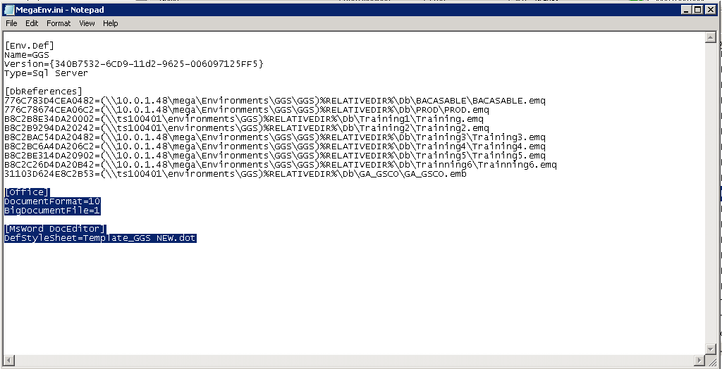 2. Below the [DbReferences] section, you find the environment-specific parameters, like the type of document (DocumentFormat=10 meaning that they were converted from .DOC to .RTF) or the templates used by default.