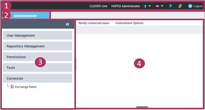 1: Toolbar, 2: Administration tab, 3: Navigation panes, 4: Edit area