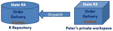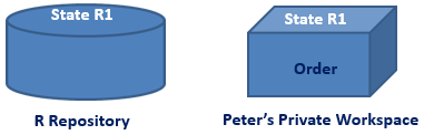 Peter opens a private workspace, his repository view is state "n" (R1).