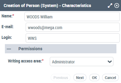 9. (With the HOPEX Power Supervisor technical module) Using the drop-down menu in the Writing Access Area field, select the value of the writing access area of the user.