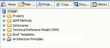 *If the TOGAF 9 - Data framework was not imported into the repository, the "TOGAF - 9 Dictionaries", "Technical Reference Model (TRM)", "Book Templates" and "TOGAF 9 Architecture Principles" folders will be empty.