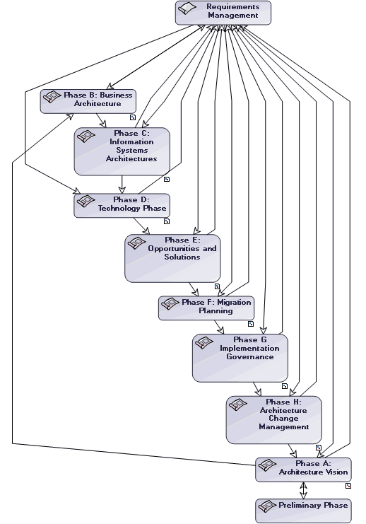 The Scheduling Diagram allows you to describe the sequencing of your organization, architecture, integration or development projects in conjunction with a TOGAF 9 framework.