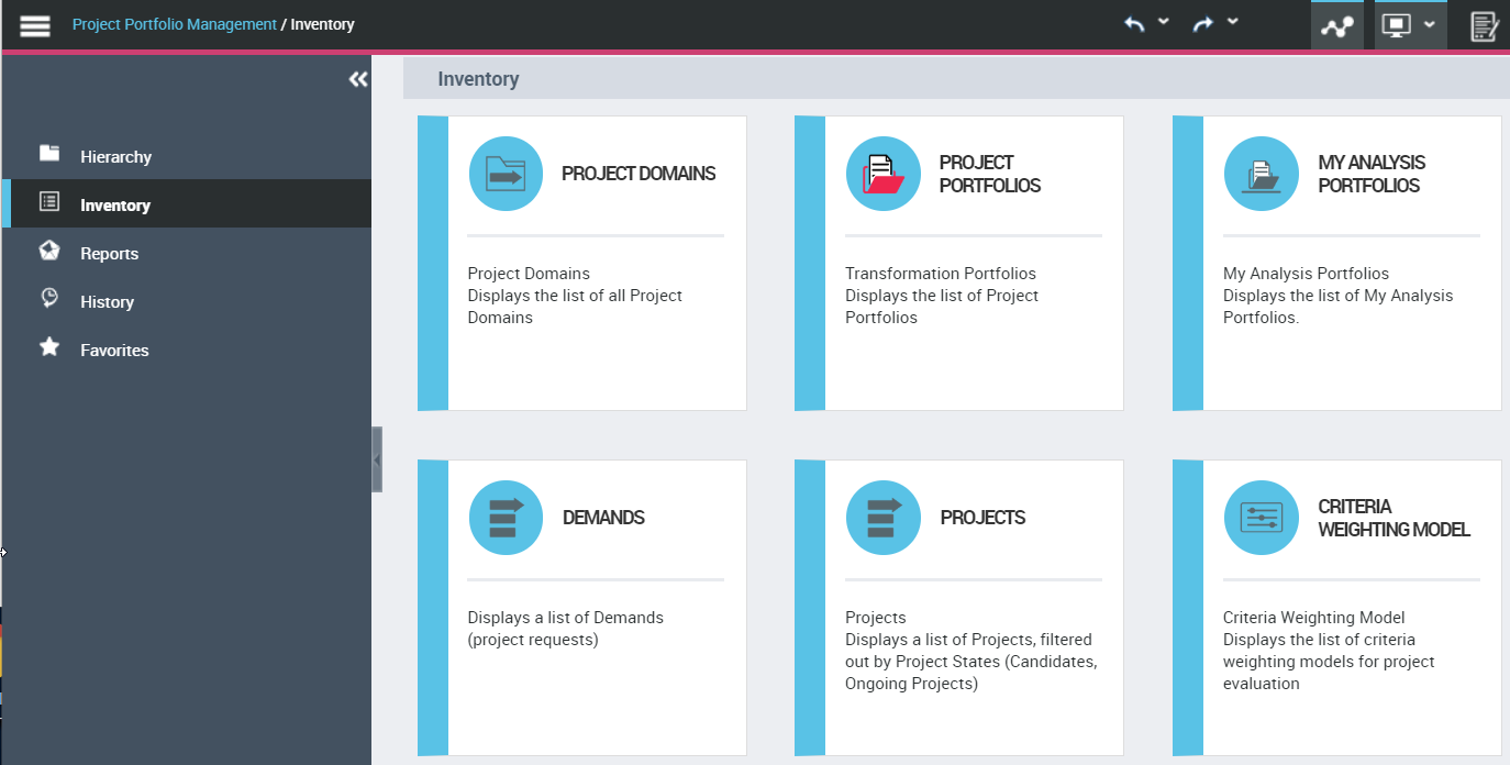 A list of tiles is proposed to help you to manage your Project Portfolio project: