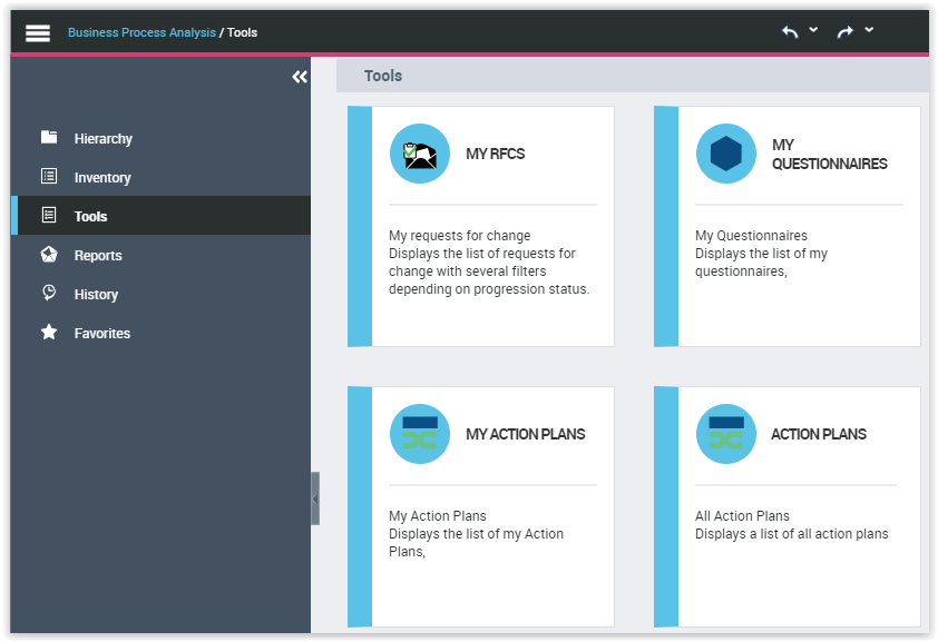 HOPEX Business Process Analysis is used to specify, implement and follow up action plans, Requests For Change and evaluations.