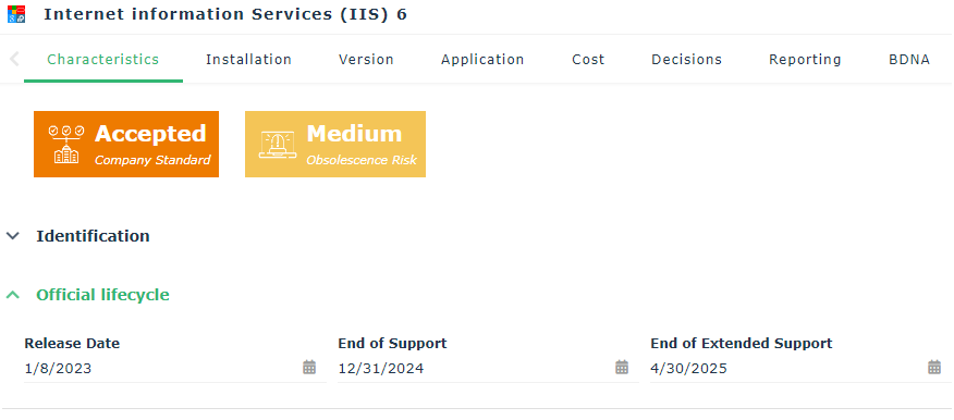 For more information on the technology official life cycle, see BDNA properties in HOPEX.