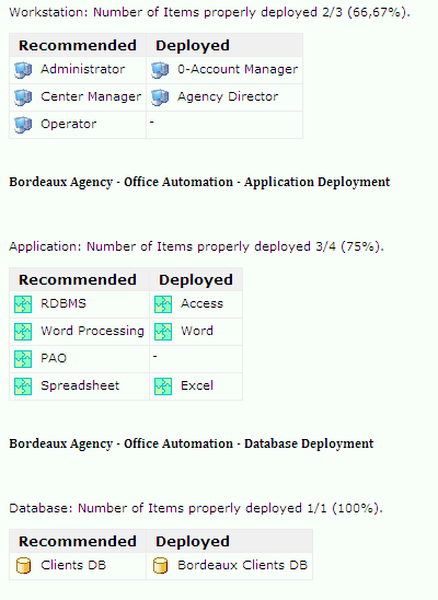 The last chapter displays more details; it gives the percentage of "Office Systems" infrastructure objects that have been correctly deployed in the Bordeaux agency and indicates missing objects.