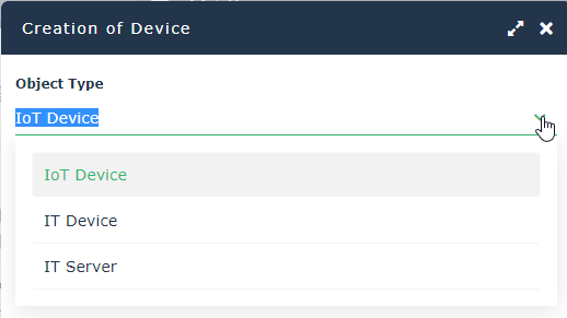 • Complex mapping: several inventory object subtypes are possible and must be chosen when creating a new object. For example, creating a new Device will request to choose whether the new device is an IT Server, an IT Device or an IoT Devices, in order to be consistent with the HOPEX IT Architecture solution infrastructure MetaModel.