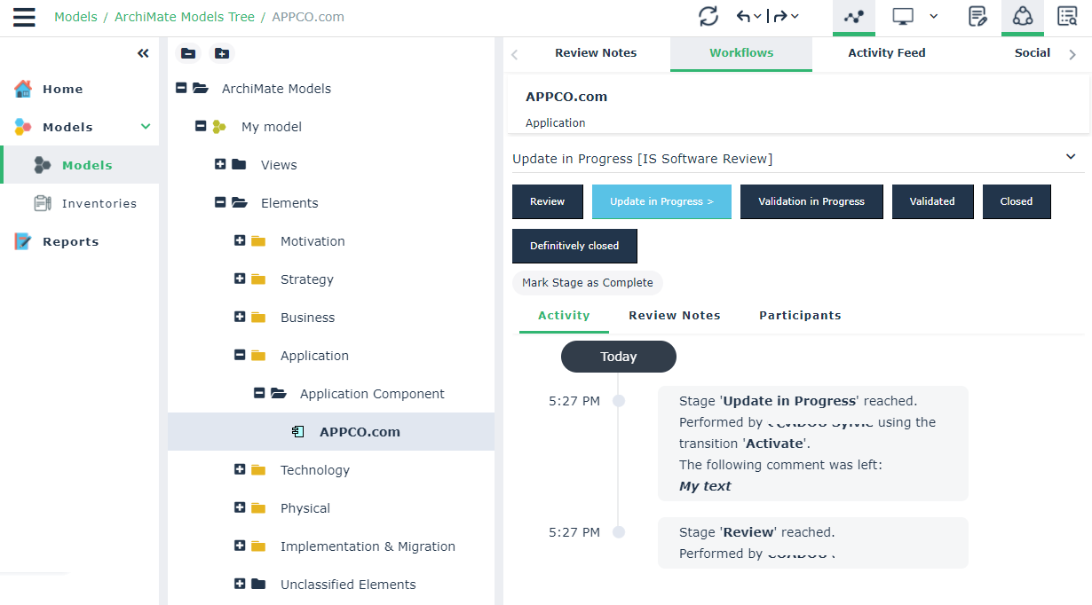 With HOPEX for the ArchiMate Framework you can use workflow from the collaboration pane.