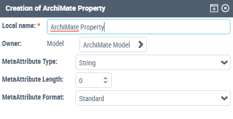 ArchiMate properties can be defined by the ArchiMate Functional Administrator for an ArchiMate Model. The new property is available for a set of ArchiMate Concepts (elements or relationships) or for all of them.