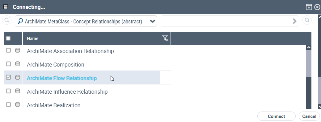 Only the types mentioned in the table below are available with the HOPEX for the ArchiMate Framework standard. The other possible types, available in HOPEX, are not compliant with the ArchiMate Standard.