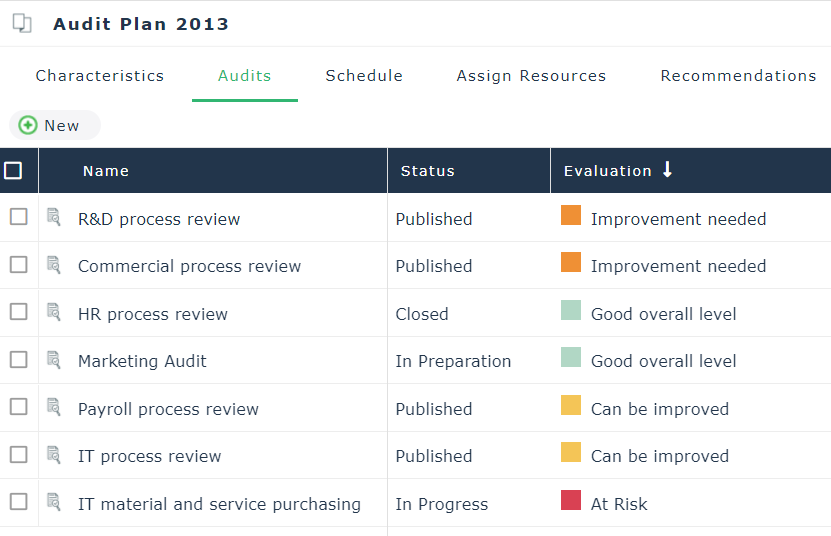 2. In the list of audits of the audit plan, click the title of the Evaluation column.