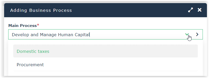 The 1st-level business processes (main processes) directly connected to the entity specified are suggested.