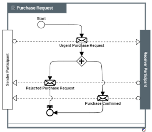 The example of purchase request processing involves several exchanges between the requester and the "Purchasing Assistant".
