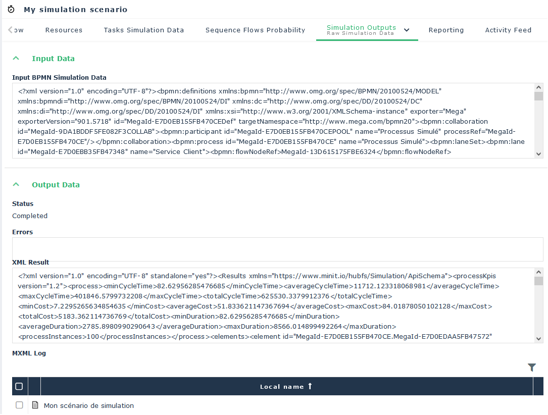 2. The Input Data section includes the XML file generated from the BPMN diagram of the simulated process and imported to run the simulation.