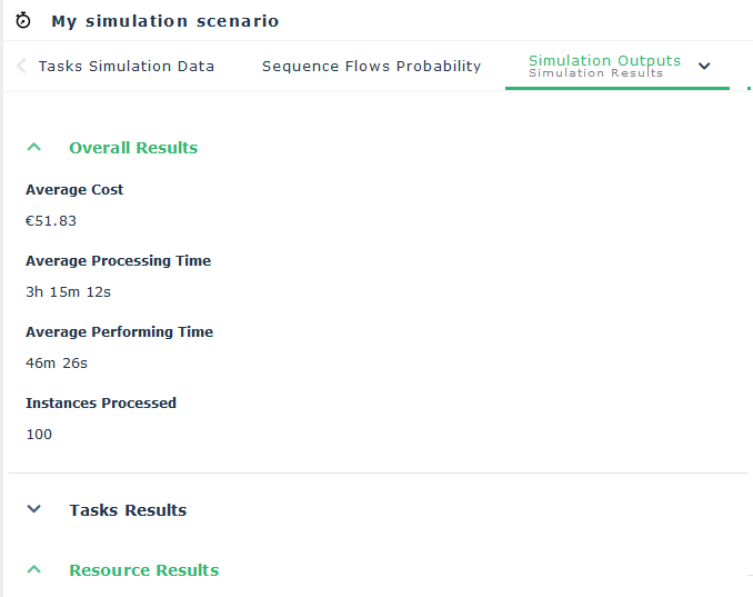 • The Average processing time corresponds to the average time spent by an instance to go through the whole process. This time therefore includes waiting time, effective working time and downtime due to scheduling.