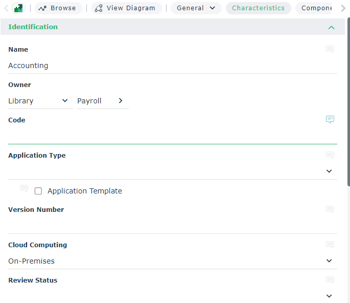 By default, the Characteristics page appears. It displays the local name of the object and its owner. Properties vary according to the object.
