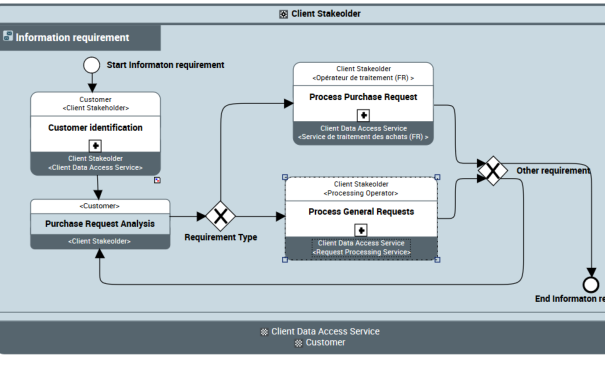 The "Information Request" exchange contract is used by the call center to take account of a customer request online. There are therefore three participants in this exchange contract: the customer, the IT applications and the customer representative who is the effective requester of the service (in this case the call center).