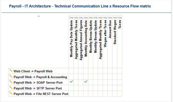 Checkmark indicates presence (or not) of a link between an Application Flow and Technical Communication Line of the analyzed Technical Architecture.