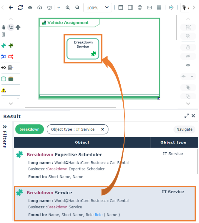 Example: when you are creating or updating a diagram, you can drag and drop objects from the Results window into the diagram.