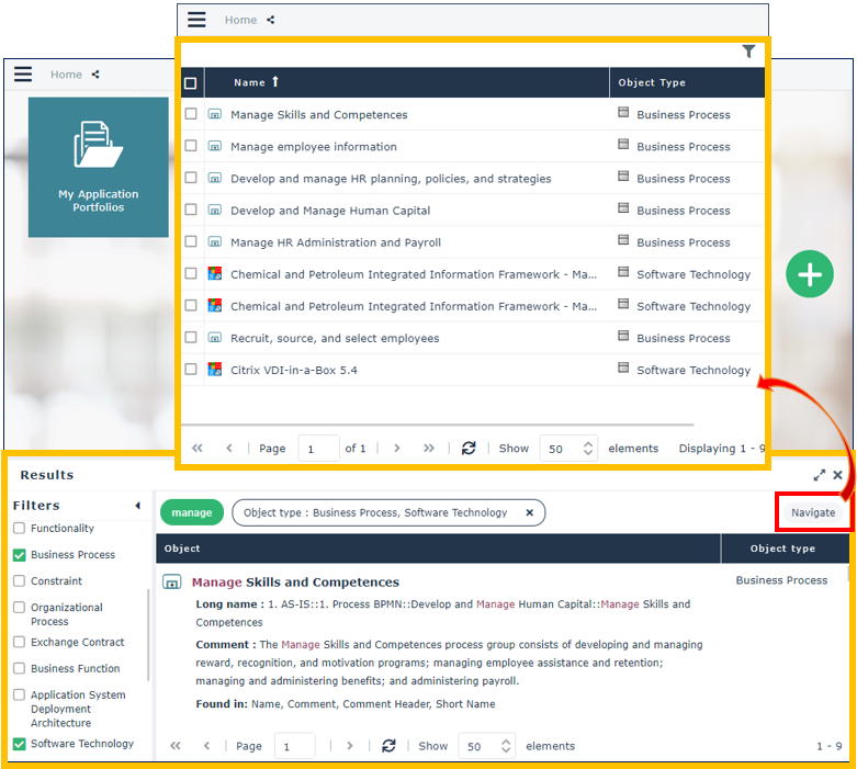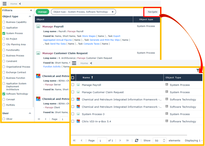 E.g.: search for “manage” with a filtering on the System process and Software Technology object types.