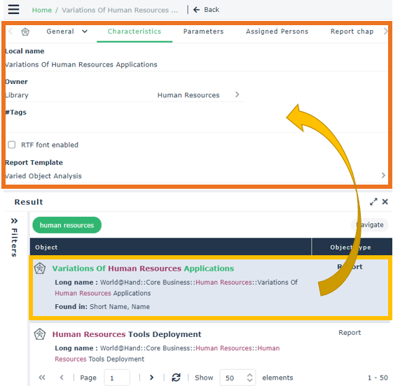 • display an object properties (replacing the search result): click the object.