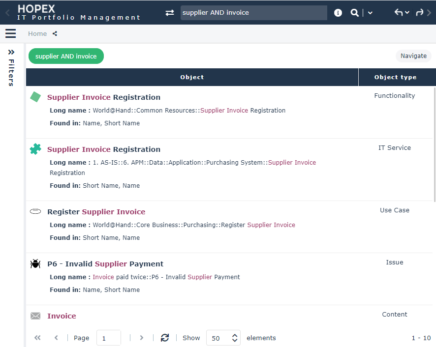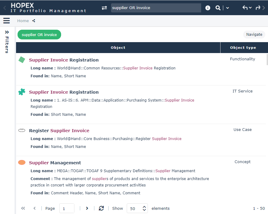 The search supplier OR invoice returns 50 results.