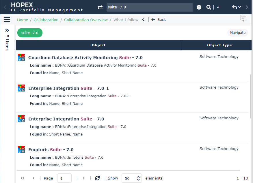 • display your search result as a list in the edit area and thus benefit from the features available on object lists: in the search result pane, click Navigate.