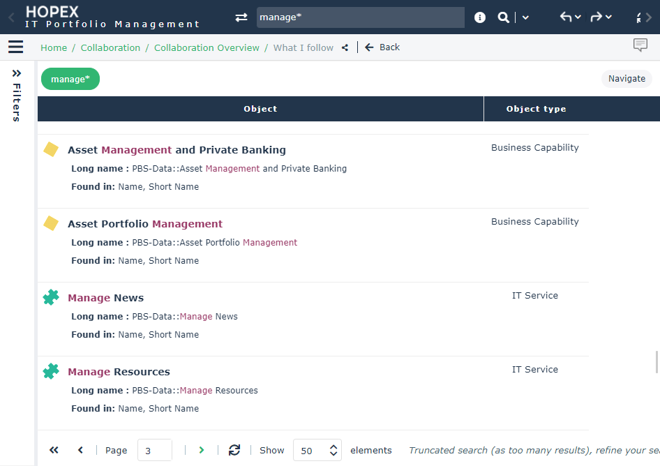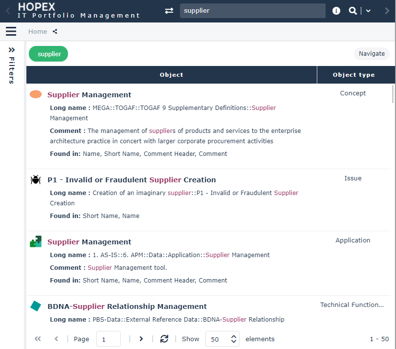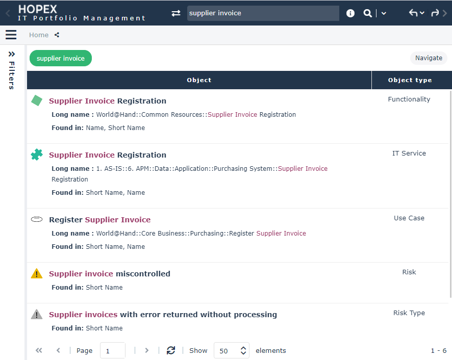 HOPEX Solutions and products enable you to execute quick searches of all objects that have been indexed. This feature is available as standard.