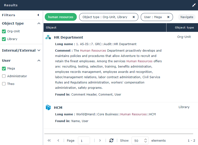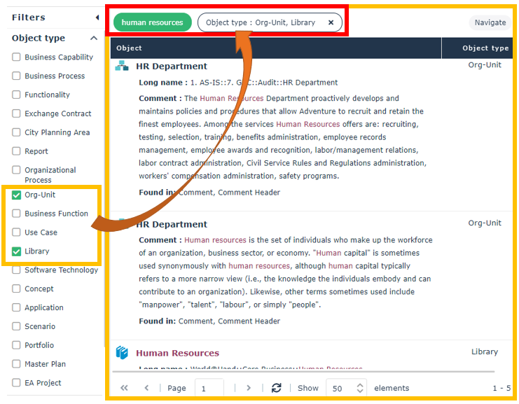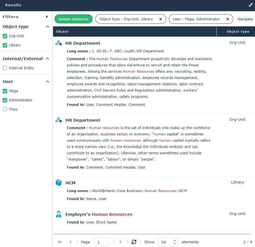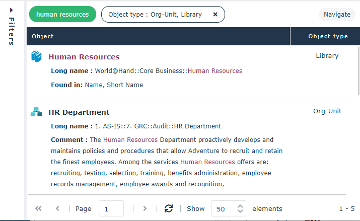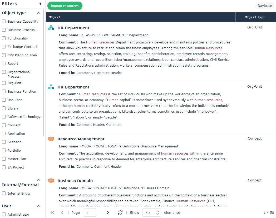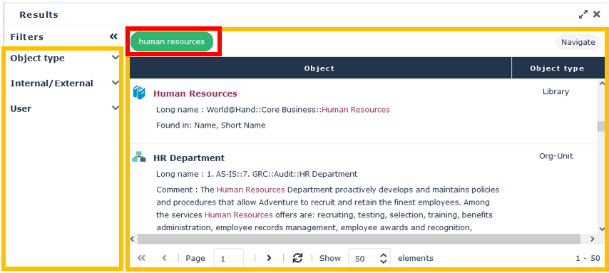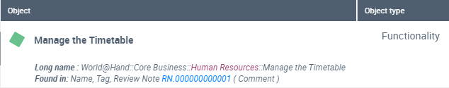 For example, the search for “human resources” string was found in the “Manage the timetable” object of type Functionality, in its Name, Tag, and Review Note.