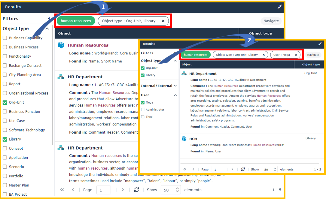 Example: display the org-units OR libraries that contain “human resources” string AND that are linked to “Mega” user.