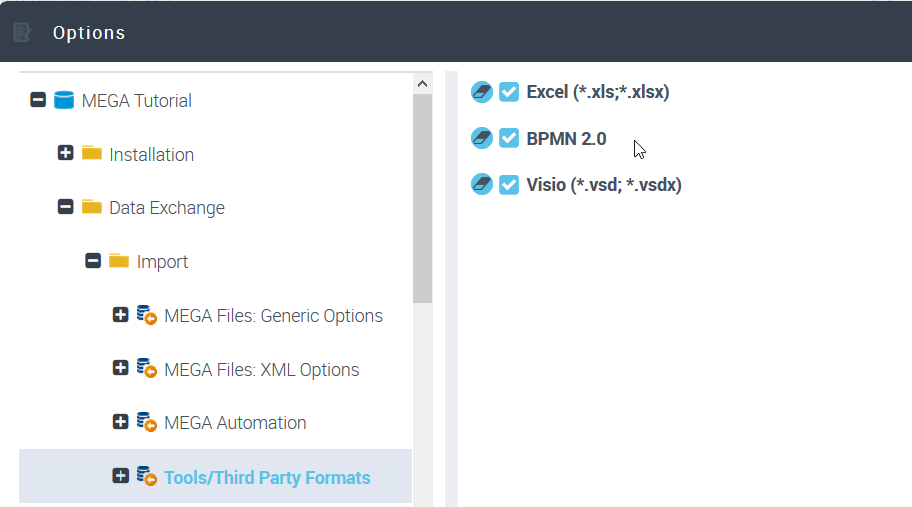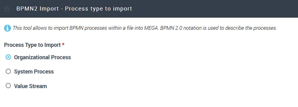 The BPMN import feature is available with HOPEX Buisiness Process Analysis and supports BPMN version 2.0.