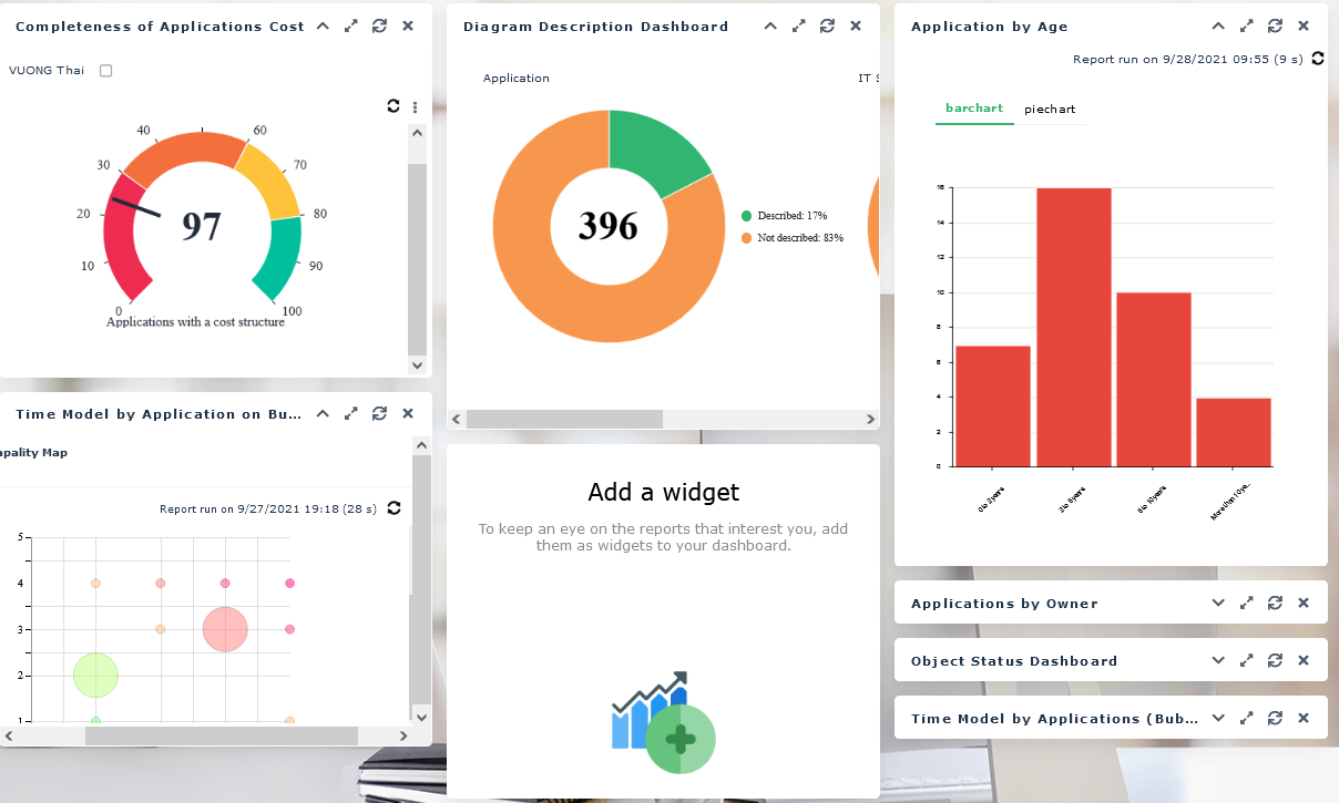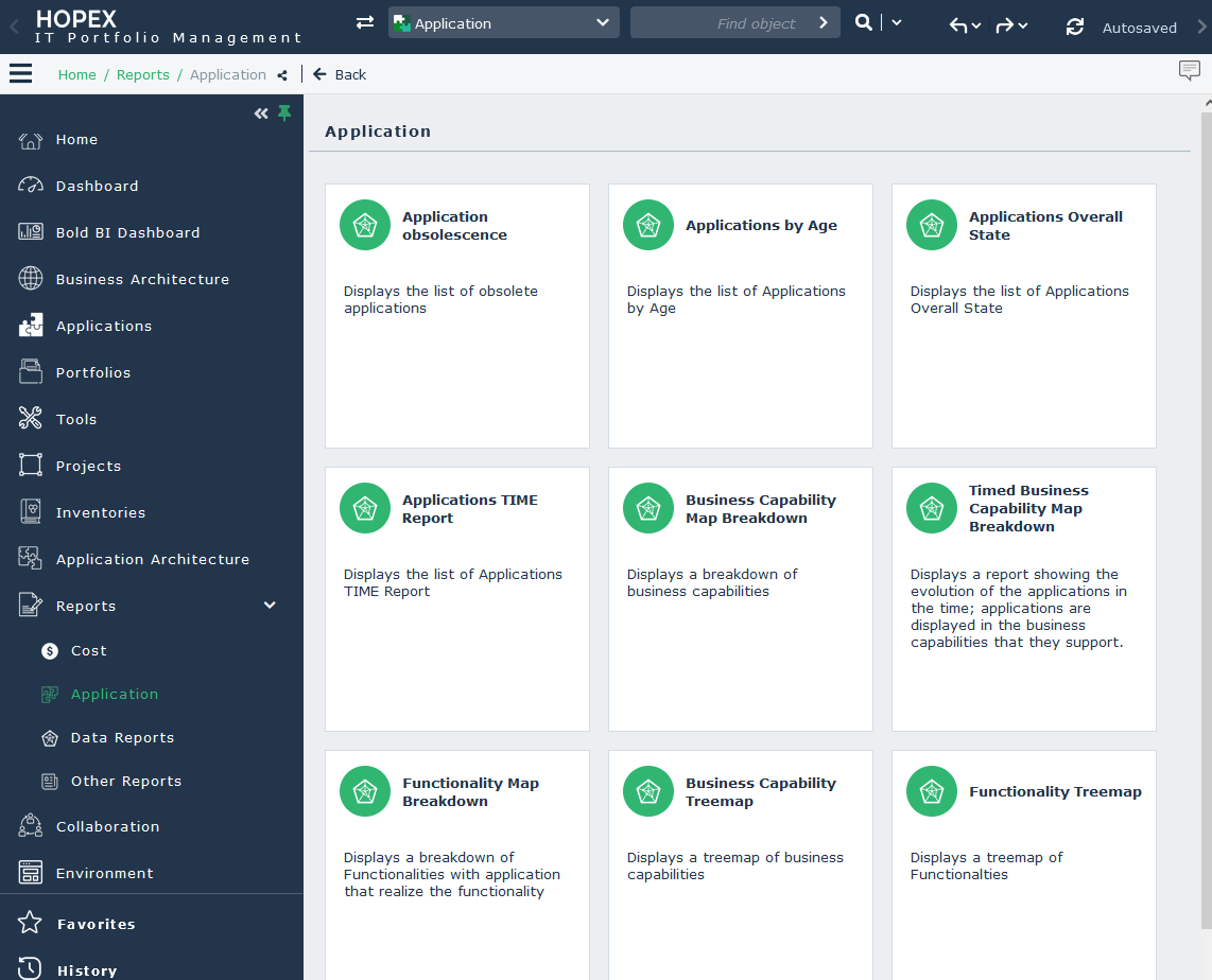 E.g.: In the IT Portfolio Management Solution, with the Application portfolio manager profile, the Reports page of an application properties provides direct access to the reports specific to the Application portfolio manager profile. Other reports are also available, here those specific to IT Architecture.