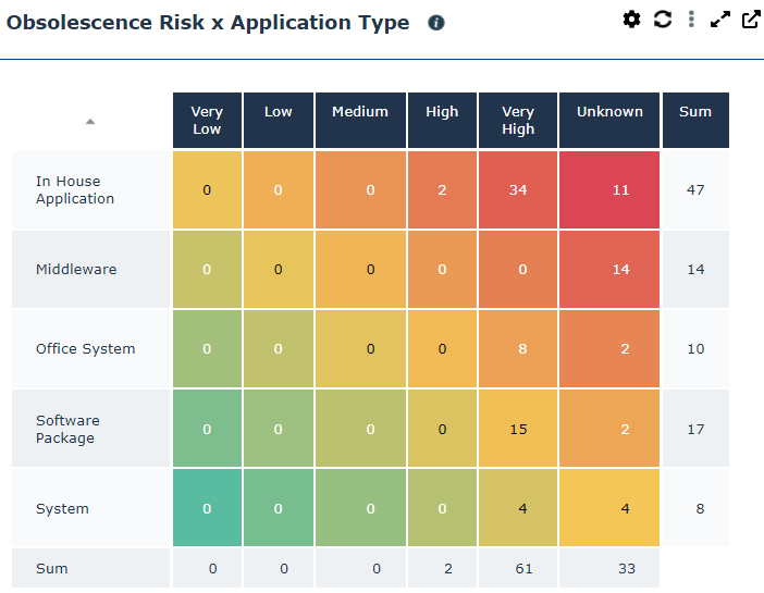 The following heatmap shows the risk of obsolescence (Very Low, Low, etc.) of a list of applications according to their type (Office System, System, etc.).