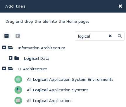 The home page appears in the form of tiles that provide access to repository data. You can add other specific tiles or generic tiles.