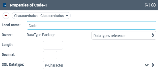 Take the "Code" datatype. Open its properties dialog box and click the Characteristics page. In the SQL Datatype field, you can see that it is connected to the "P-Character" pivot type .