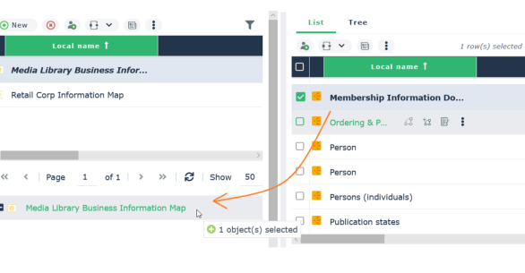 2. From the tree on the right, select the concept domains you want to include in the map and drag them to the lower part of the tree on the left, on the name of the map in question.