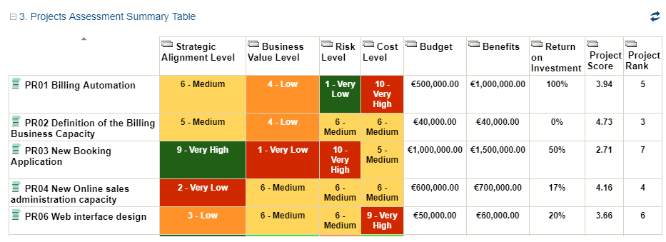 Summary table for project assessments