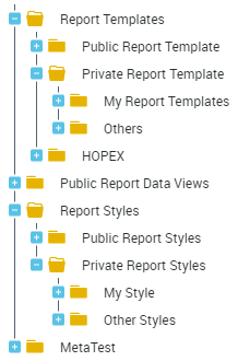 • Report Templates, where the Report Templates are classified by their sharing characteristics (Private or Public). You can add sub-folders for a more precise Report Template classification. The HOPEX folder includes standard Report Templates.