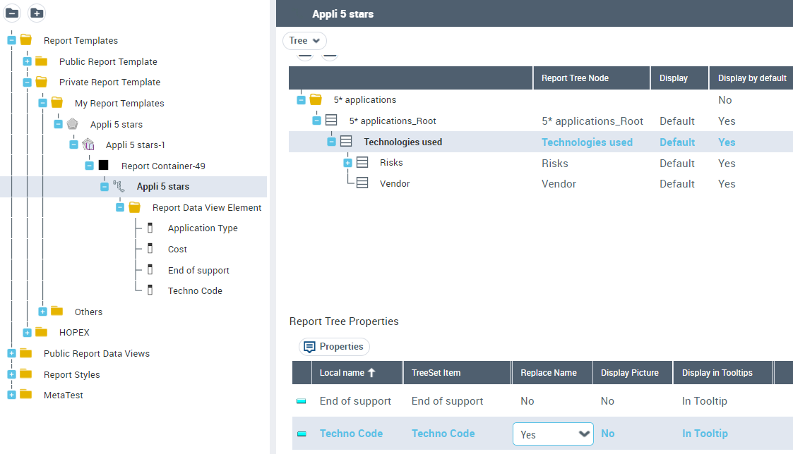 3. In the Report Tree Properties list, in the row of the property concerned, use the drop-down list to set Replace Name to "Yes".