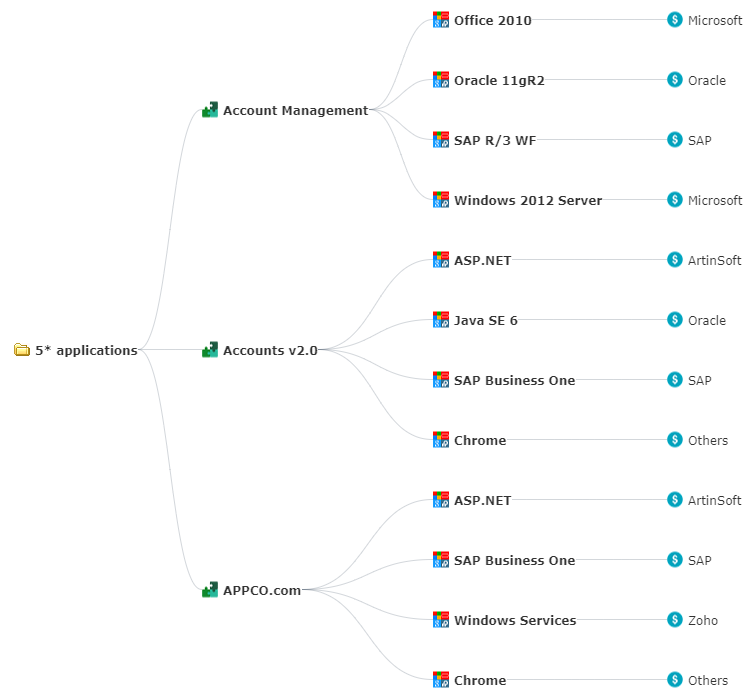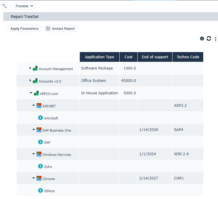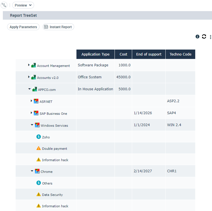 The TreeSet Definition displays the Technologies used by an application, and for each Technology it displays its Vendor and its risks (if any).