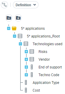 Ex. 2: this TreeSet Definition is based on the Applications that have a 5-star ranking, and displays for each of them its Technologies, and for each of its Technologies its Vendor and Risks.