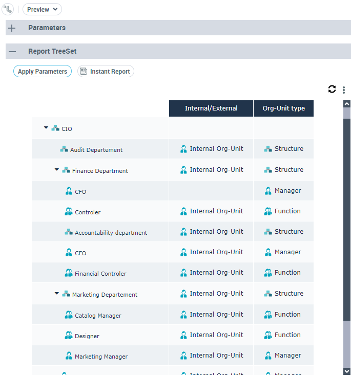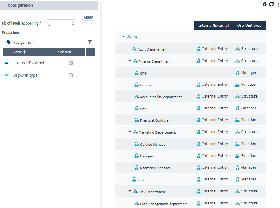Ex.: this TreeSet is based on the CIO Org-Unit and displays for each Org-Unit child its Internal/External and Org-Unit Type values.