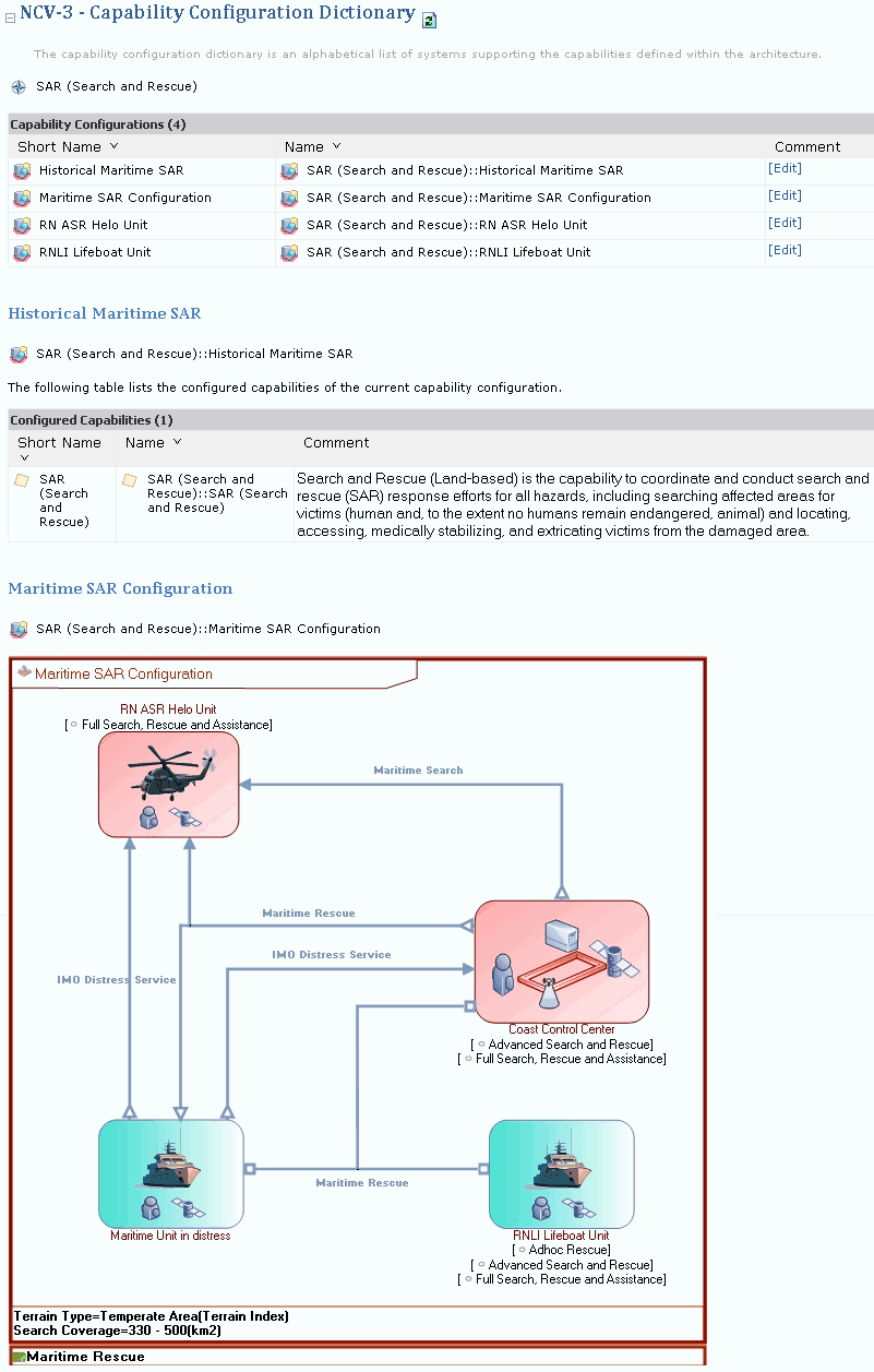 In the Capability Phasing chapter above, the SAR (Search and Rescue) capability is covered by four different states, three of which have been detailed; "Maritime SAR Configuration [Adhoc Rescue]", "Maritime SAR Configuration [Advances Search and Rescue], "Maritime SAR Configuration [Full Search, Rescue and Assistance]". At the Maritime SAR Configuration [Adhoc Rescue] state, the systems available to support the capability are represented by the Maritime Unit in Distress and RNLI Lifeboat Unit resource architectures. The names of the two projects contribute to implementing the capability during this state; "Rescue Unit Training" and "Develop Maritime Assistance".