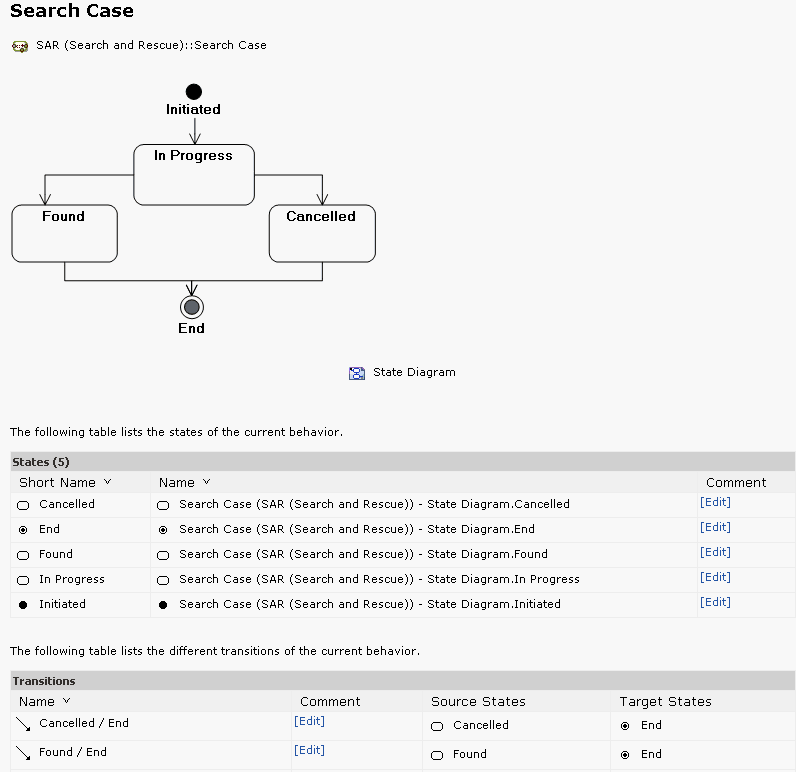 This chapter lists all the state machines attached to the selected activities. The report starts with a simple table of the state machines (short name, long name, comment) and the linked activities.
