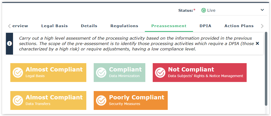 It is useful for the DPO or the Privacy team to get an overview of the processing activity compliance levels. It will facilitate prioritization of subsequent actions (decide if you need to perform a pre-assessement or a DPIA).